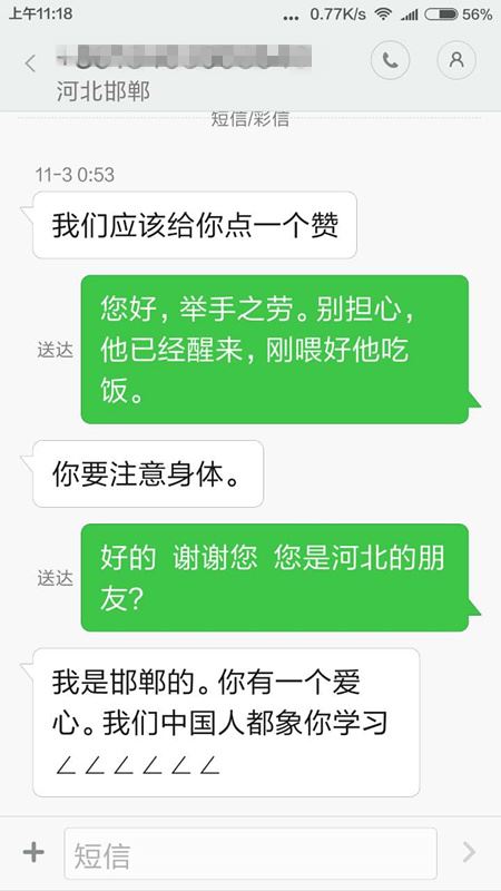 一位河北邯郸手机号发来短信称为她点赞,“我是邯郸的。你有一个爱心。我们中国人都像你学习”。