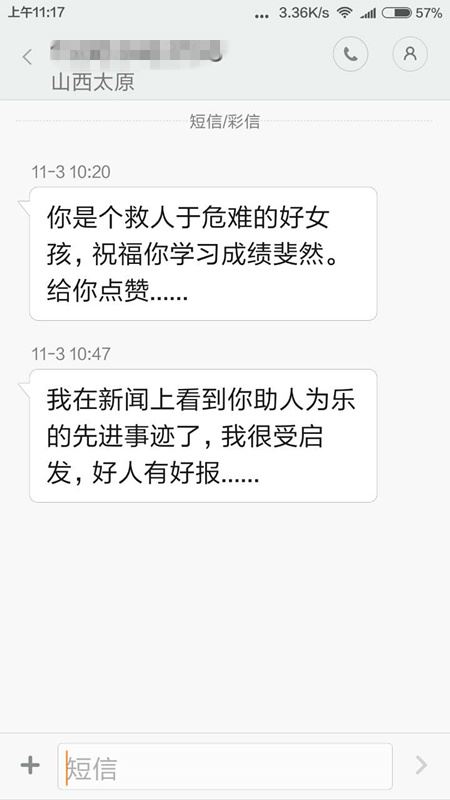 一位山东滨州手机号发来短信称赞她的正能量行为,表示“我要在郑州我会去的,社会上有你这样的人,真的很好”。