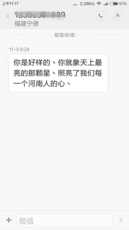 一位福建宁德手机号发来短信“你是好样的,你就像天上最亮的那颗星,照亮了我们每一个河南人的心”。
