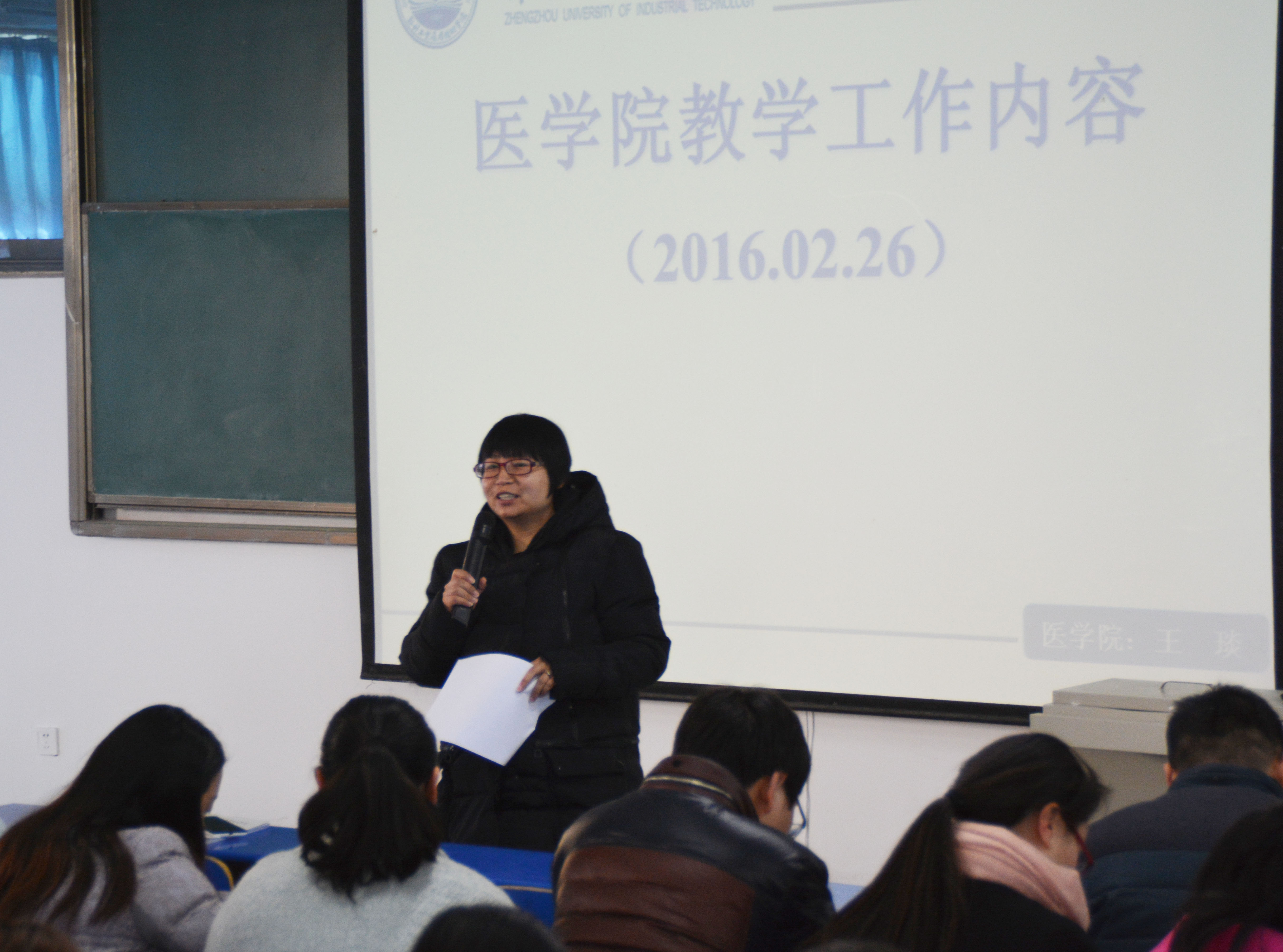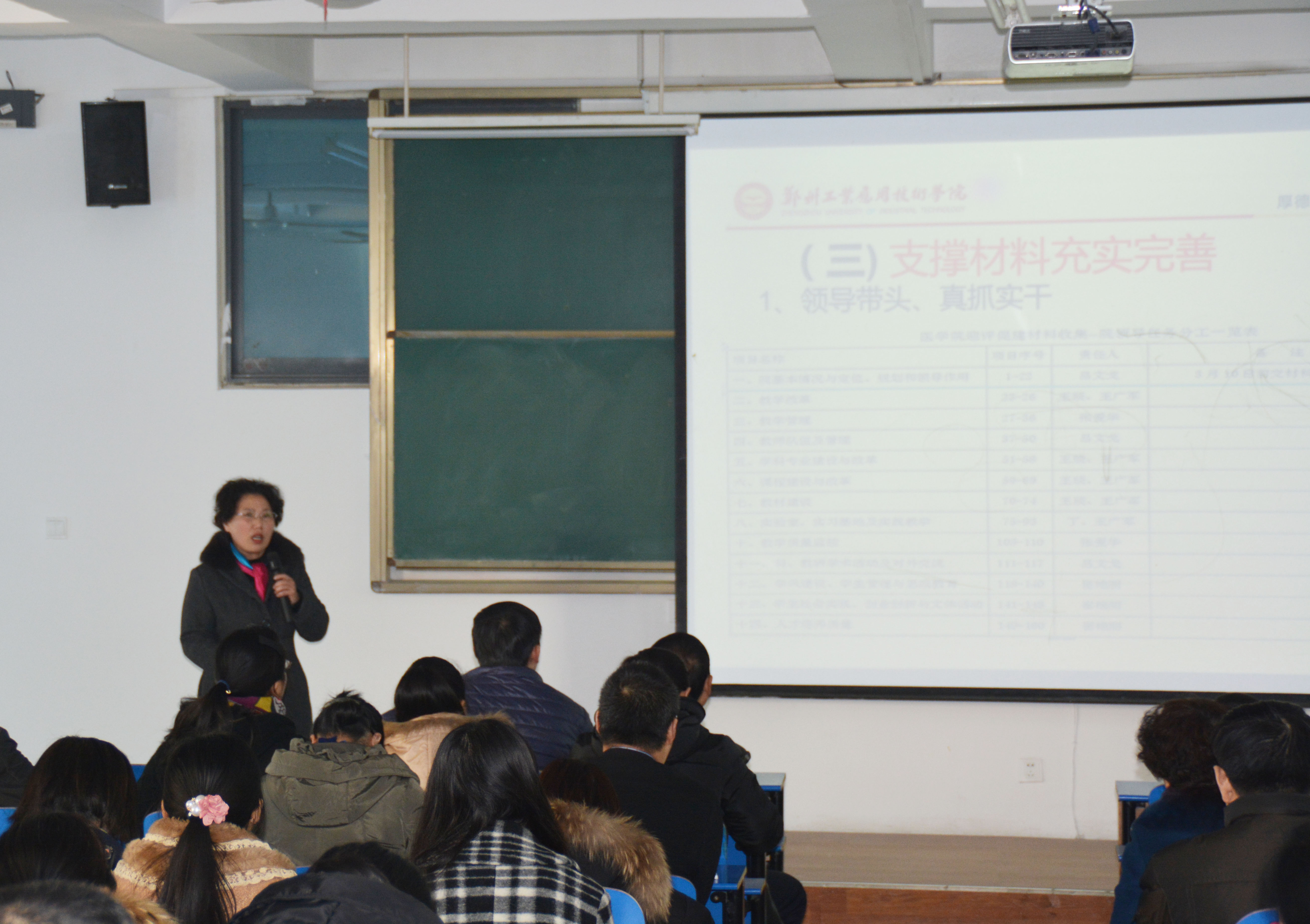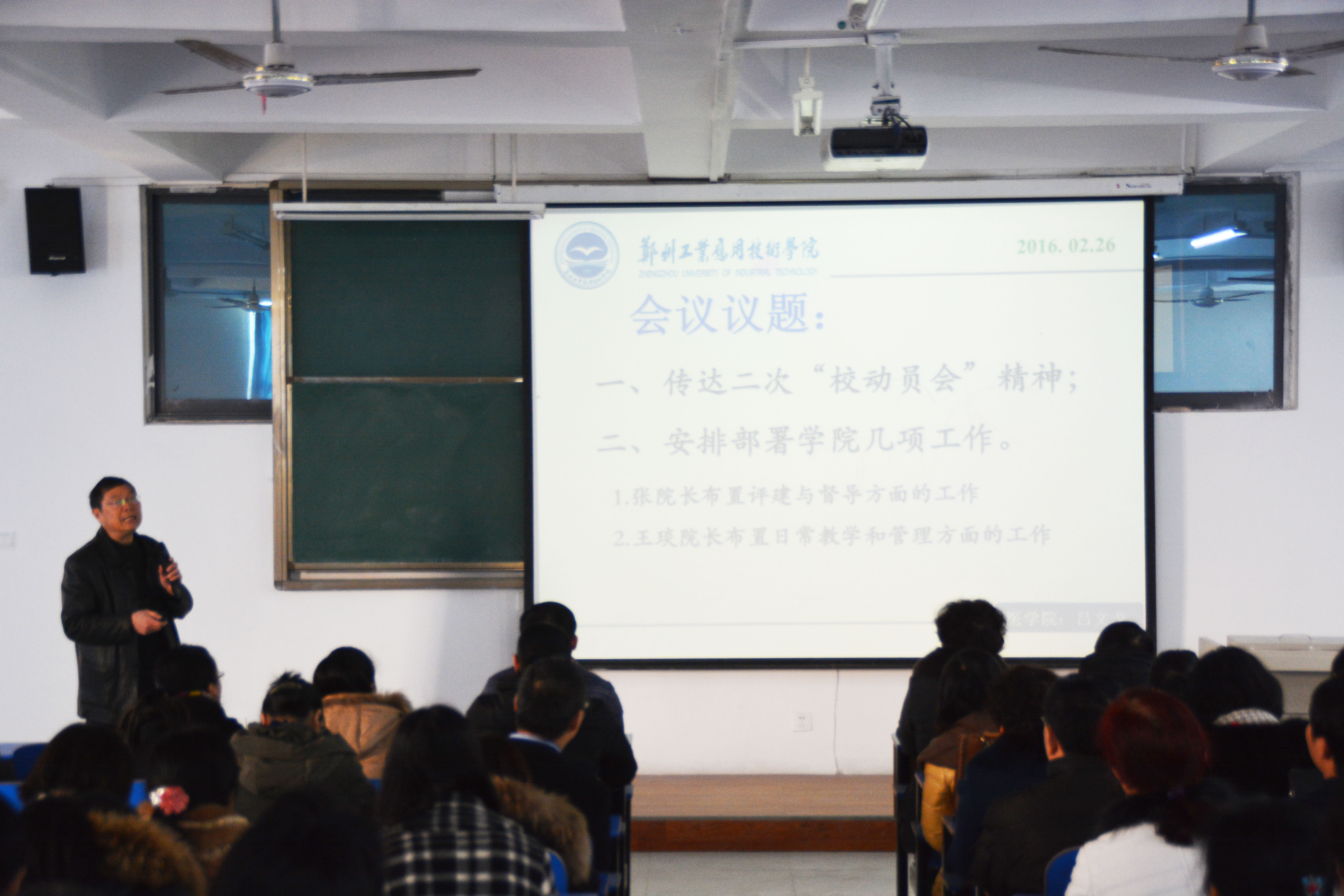 二〇一六年二月二十六日上午九点,beat365教职工评建工作动员大会在医学楼北二教室进行。郑州工业技术公司迎评工作进入倒计时阶段,根据公司相关精神吕方戈经理作了评建工作总动员并对本学期教学工作提出更高要求;张爱华副经理就迎评工作最后冲刺阶段的具体工作作了安排和要求;王琰副经理通报上学期末教学检查情况及对近期教学工作作了具体安排。
