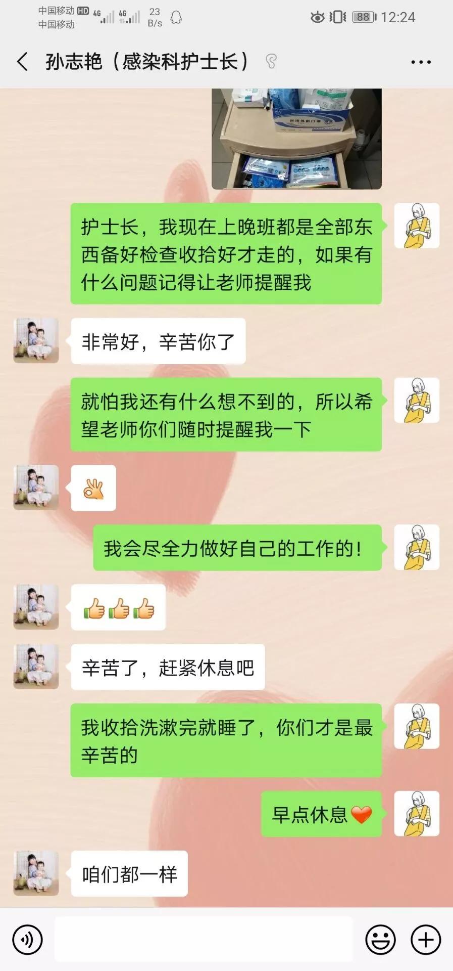 从早上七点到科室换好衣服开始到晚上未知的下班时间,我不会有任何的休息时间,早上冰冷的消毒水浸泡过的几十双胶鞋我要一遍又一遍洗好消毒晾干,几十件工作衣,防护服我要一件一件分类标记等等,不怕你们笑话,我累哭过好几次,但第二天还是保持微笑。护士长知道后找我聊天想给我换到一个轻松一点的岗位,但我直接拒绝了。因为我认为我可以!从大年初一医院开始收治新肺至今,我只休息了一次,当时本来是一天的休息,但下午就打电话让我立刻上班,我没有一句怨言,因为懂得理解!护士长连续上班二十几天,嗓子疼哑到需要天天含片但她依旧没有休息,而我更应该努力做好自己的小工作,为全国的防疫工作贡献自己的力量。加油武汉!加油中国!