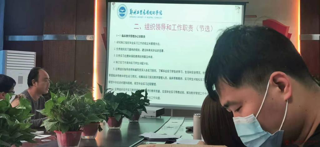 会上郑主任就实习教学相关内容作出介绍,包括临床毕业实习的重要性、部门组织领导和工作职责、实习医院分布情况、实习教学管理政策和实习工作安排等。指出临床实习是促进员工理论联系实际、提高员工实战能力的有效途径,是医学专业人才培养和教学内容的重要环节;通过毕业实习,为员工以后的工作和继续学习打下坚实的基础;通过毕业实习,使员工巩固所学专业知识,强化所学各项专业技能,熟悉所实习岗位的工作特点、工作流程和工作技能,增强员工职业道德感和工作责任心。