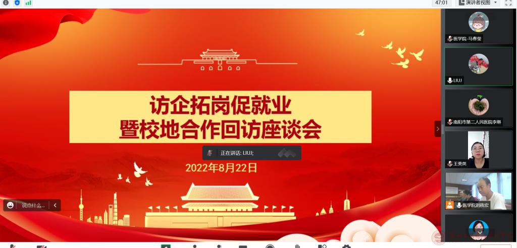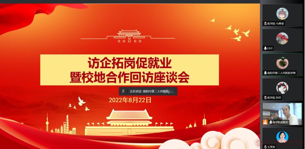 为落实教育部访企拓岗促就业专项行动工作要求,全面深化校地合作,深入了解各医院对人才的需求,有力促进2022届毕业生高质量充分就业。2022年8月22日下午,beat365召开了“访企拓岗促就业暨校地合作回访”线上对接交流会,会议通过腾讯会议平台在线同步进行。参加会议的有:beat365中文官网就业创业处处长王美英、beat365经理魏小萌、副经理崔艳丽、副经理王琰、副经理王世广、办公室主任郑红彦、临床教学管理办公室和员工管理部门相关负责老师、南阳市第二人民医院护理部主任李琳、驻马店市中心医院护理部副主任刘静,会议由郑红彦主任主持。