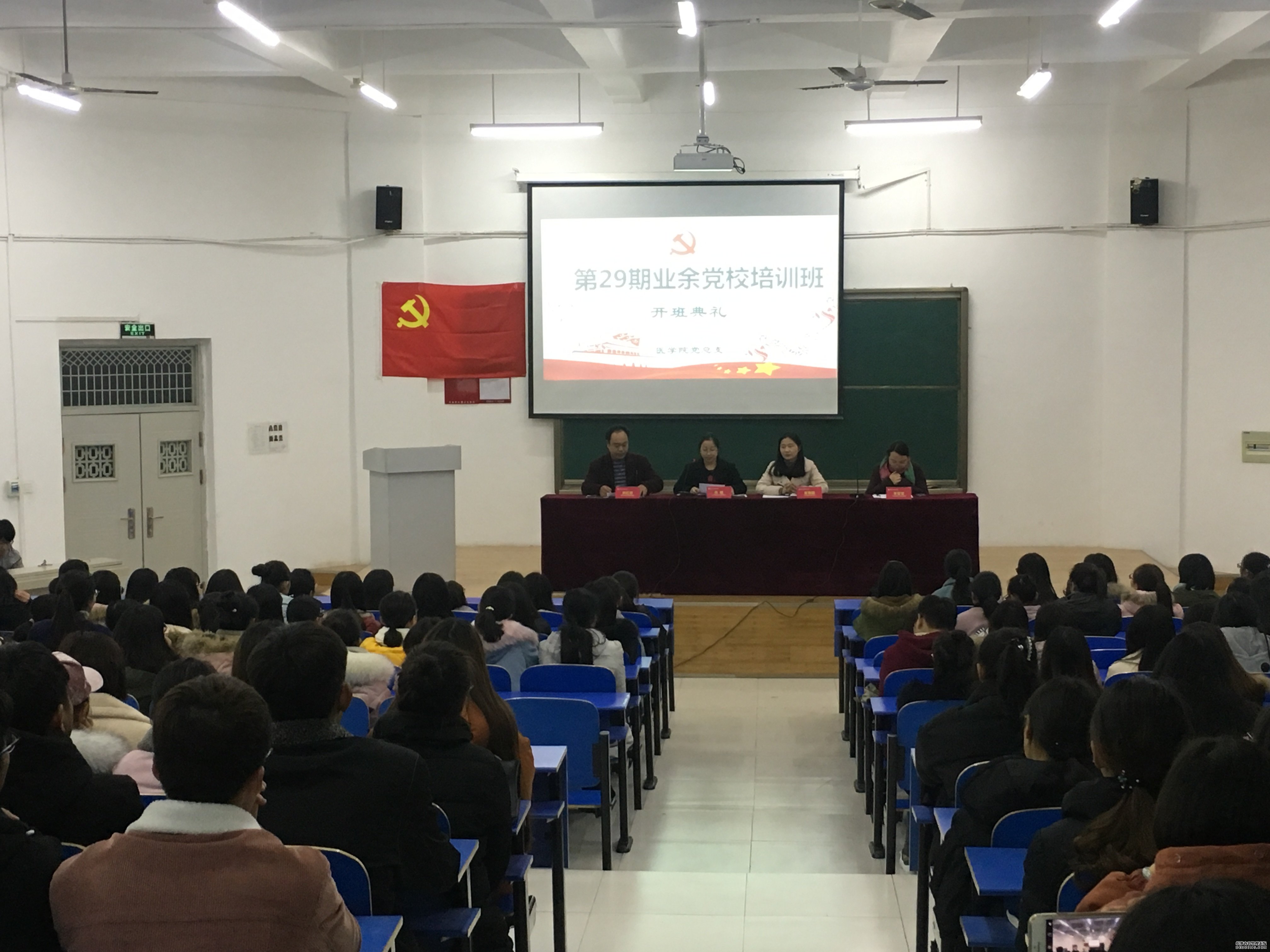 典礼在雄壮嘹亮的国歌声中拉开帷幕。会议伊始,由郑红彦同志宣读了第29期入党积极分子培训班日程安排;紧接着,由李莹莹同志宣读党课培训班考核规定,并告知每一位入党积极分子须严格执行考核制度;然后,入党积极分子代表沈双丽同学发言,倡议广大入党积极分子要珍惜学习机会,严格要求自己的同时提高自身政治素养。