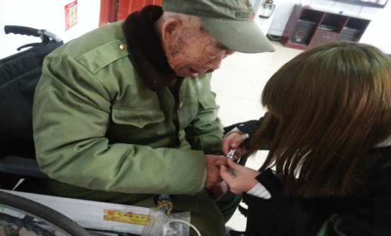 图为志愿者为老战士剪指甲