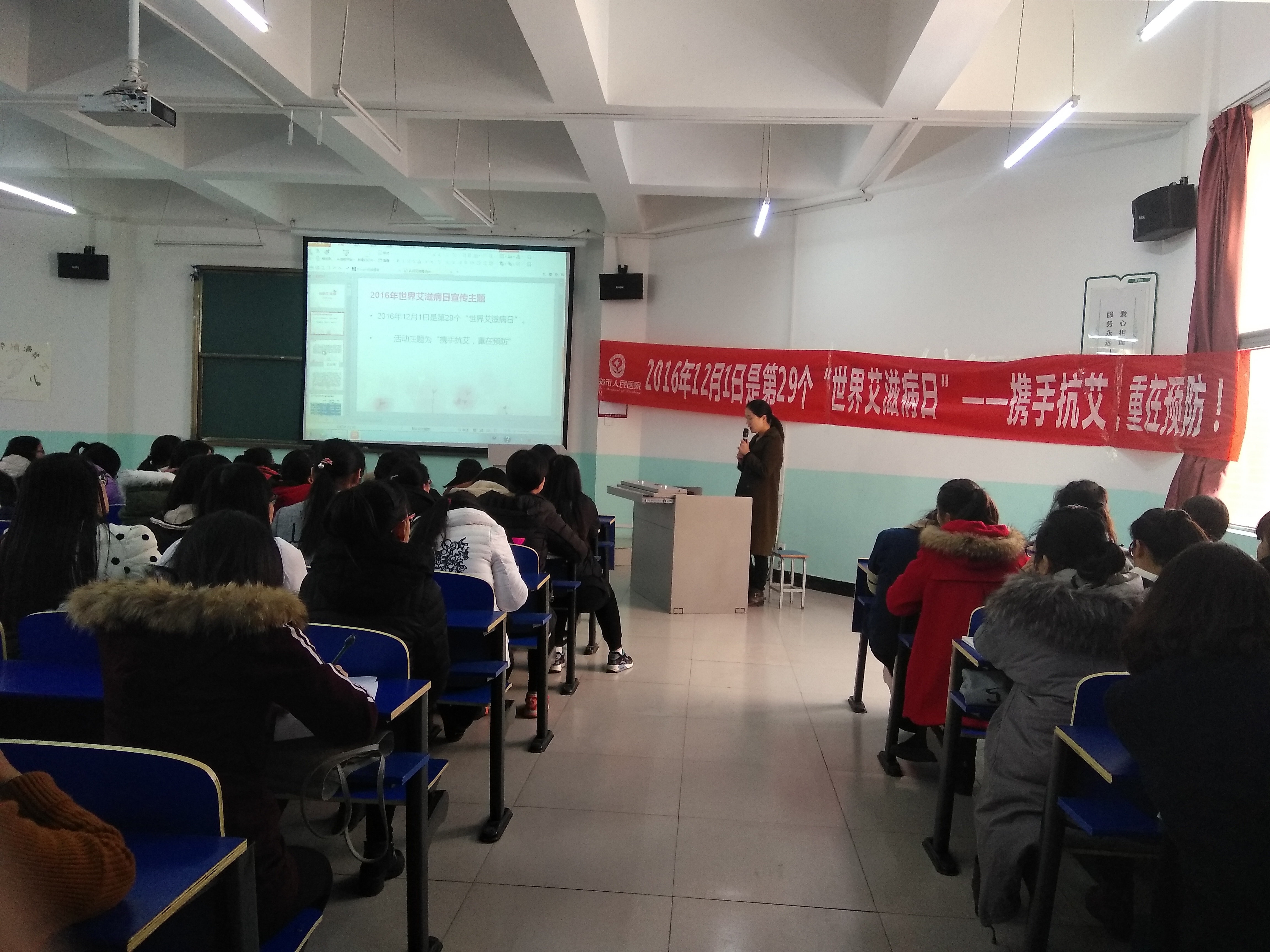 12月1日为“世界艾滋病日”,为普及艾滋病防治知识,增强老员工自我保护意识,12月2日下午14时,公司于西校区明德楼南二阶梯教室开展“世界艾滋病日”专题知识讲座,新郑市人民医院妇产科主治医师李丽娟医生莅临会场并担任此次讲座主讲人。公司16级护理学200余名员工到场参加。