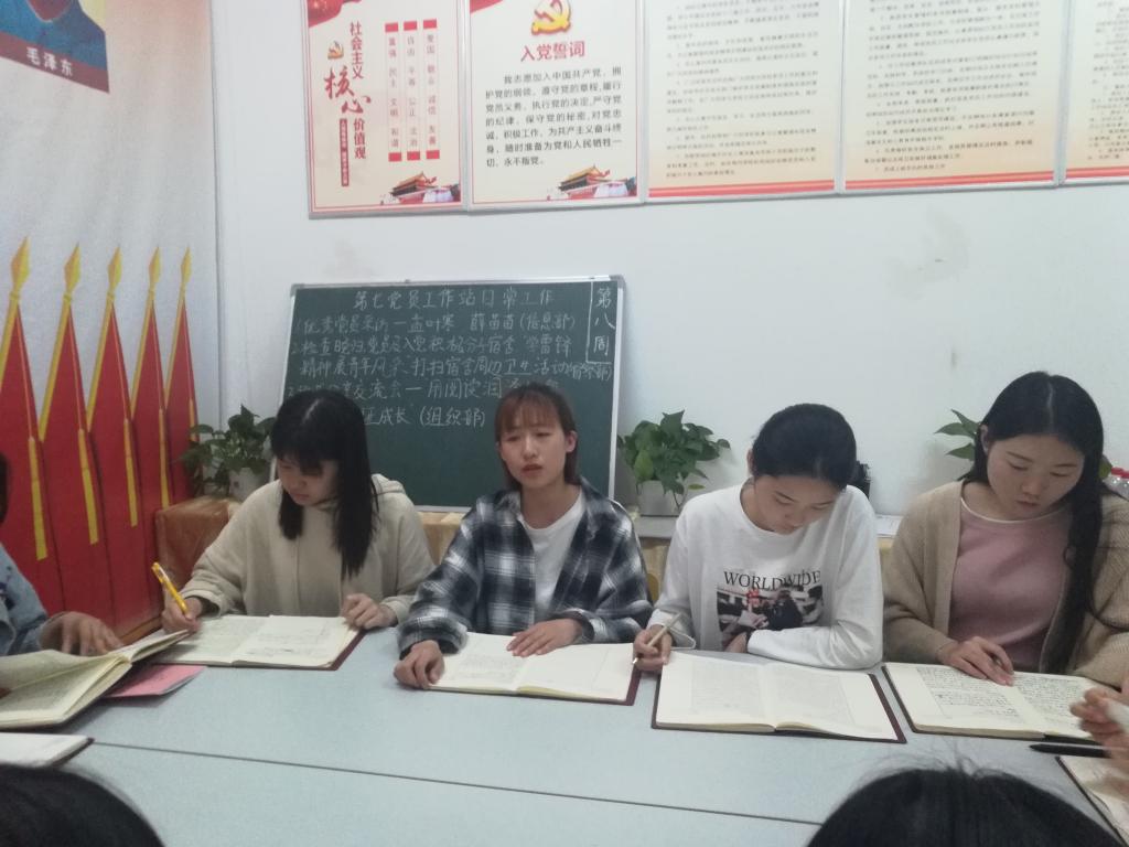 2019年4月17日晚上9点,第七党员工作站组织员工党员、入党积极分子开展“用阅读滋润生命,用文字见证成长”主题读书会。其目的是培养同学的文学素养,养成良好的阅读习惯,从而树立正确的价值观。