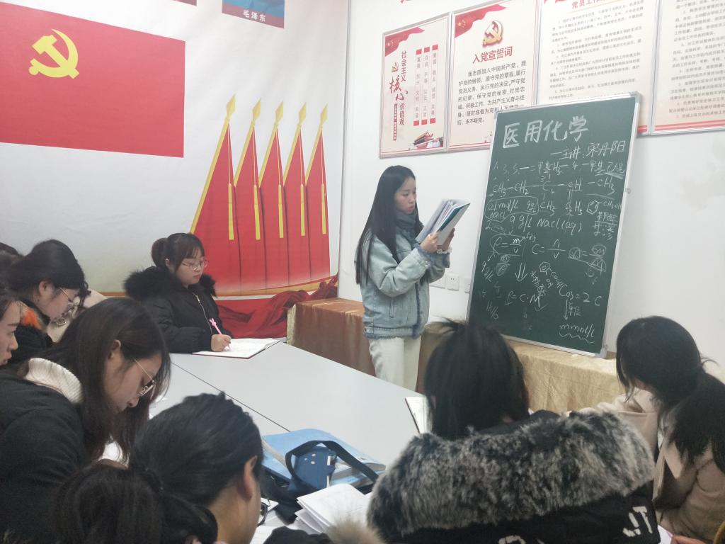 为引导入党积极分子积极参与学习,打造良好的学习氛围,使期末考试做好积极的复习准备。第七党员工作站在2018年12月14日开展了“学霸辅导班”第三讲活动,此次由17级护理学15班的宋丹阳主讲《医用化学》课程。