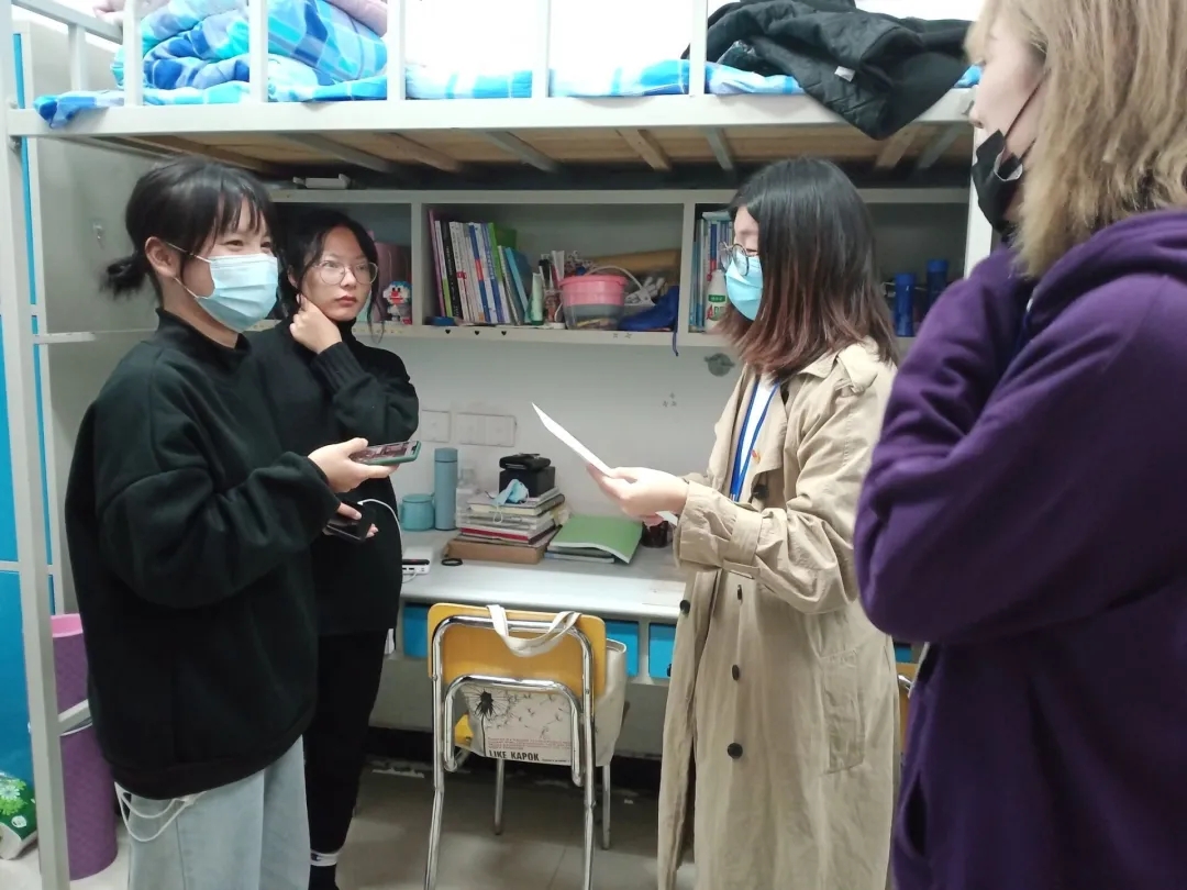 在走访H2-121宿舍过程中,员工党员了解到次旺普赤是一名藏族同学,问到学习方面的问题时,次旺普赤同学答道:“老师上课语速较快,我感到很不适应,跟不上节奏。”员工党员罗新鼓励她平时和同学们多沟通,尽快适应老师的说话语速和上课的节奏,也可以私下多和老师沟通交流,做好课前预习。在生活方面,员工党员李佳音督促同学们要勤洗手勤消毒,开窗通风,搞好宿舍卫生。保持良好心态,做好个人防护,将精力积极投入到学习中,挖掘自我潜能,成就更好自我。