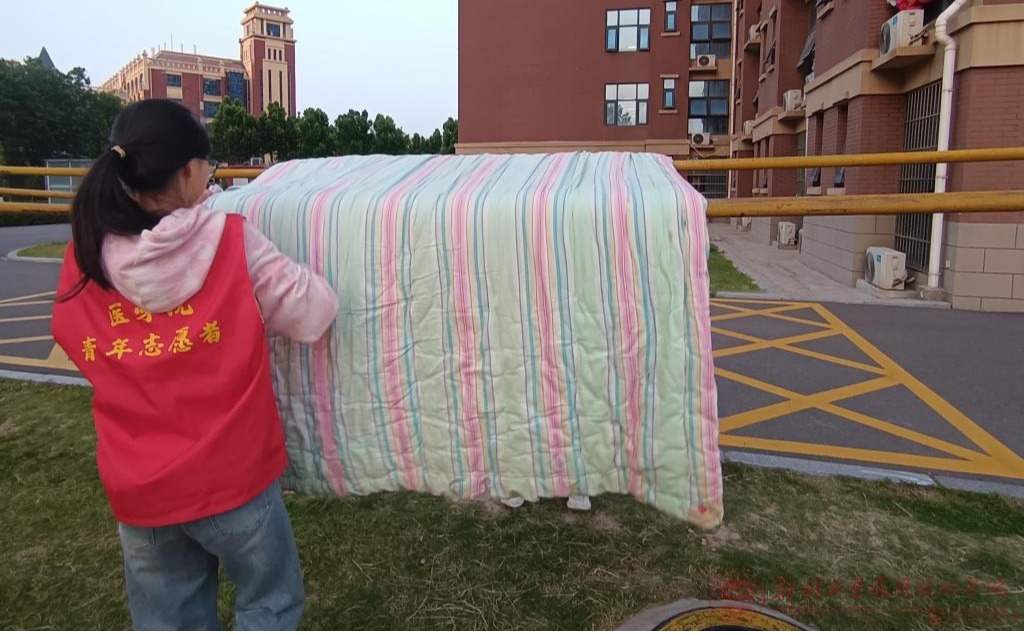 天朗气清,云开日出。为营造良好的校园生活,打造员工舒适的学习生活环境,弘扬志愿服务精神,彰显新时代青年担当。beat365持续推进落实“我为同学做件事”系列志愿服务活动。5月25日,21级护理学6班员工徐文静、赵悦悦参与了“郑医在行动,让被子更温暖”的活动。