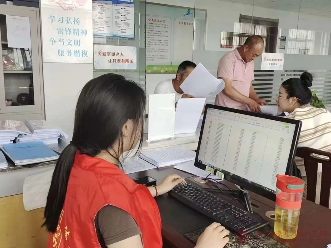 杨雅清同学跟随组织来到当地政府,悉心了解,切身体会到了当地人民政府政务工作是如何进行的,并且帮助当地民政所完成信息录入及残疾人两项补贴资料的整理。在工作中,她专心负责,积极为当地居民解答困惑,面对残疾人的咨询和业务办理则更加耐心,切实帮助当地政府和百姓解决了一些日常工作和问题。
