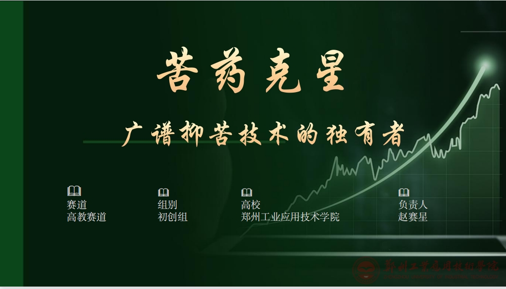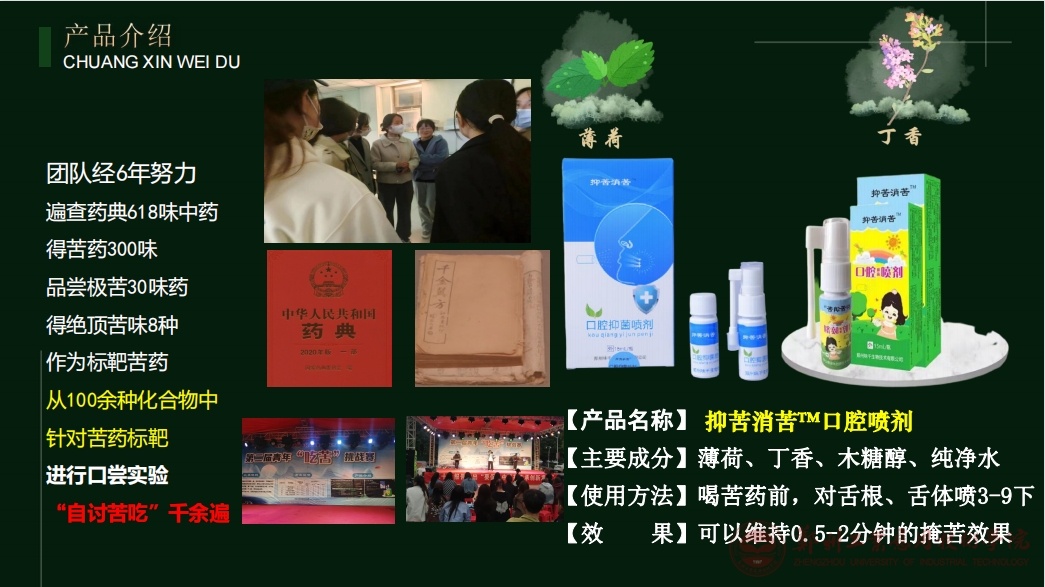项目名称:苦药克星—一款辅助中药的口腔喷剂。项目由张景亮、常文超、董岳等老师指导,本科生赵赛星担任项目负责人。经过6年研发,项目组在掩味矫味技术上有了最新突破,研制出了抑苦消苦口腔喷剂,其通过与苦味感知中的瓶颈通路,Na+离子通道蛋白的结合,广谱干扰苦味形成及传导机制,从而提高个体对于苦味感受阈值,实现了对复杂苦味成分的广谱、有效的掩味。经充分调研,我们的解决方案在全世界独一无二,实现了本领域的全球新(first class),全新品类突破。解决了数千年来困扰人类的中药方剂的适口性问题,积极推动中医药的创新与发展,推进中医药现代化,为中国和世界的医学发展进步做出重大贡献。