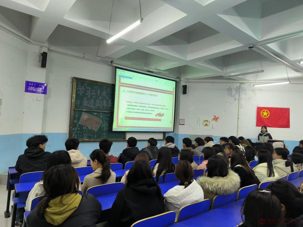 在本次活动中,各班团支书首先让全体同学起立奏唱团歌,在团歌的奏唱中,能够感受到当代青年坚韧不拔的精神和磅礴的力量。随后,各班团支书以课件的形式认真讲解党的二十大精神,同时以播放视频让同学们真正的了解党的二十大精神,体会中国共产党的峥嵘历史,使同学们明白了作为青年一代,我们大有可为,大有作为,更要坚定理想信念,永远听党话,跟党走,砥砺奋进前行。活动最后鼓励同学们踊跃发言,讲诉他们心中的党的二十大精神以及奋进新征程的目标,体现出自身对党的二十大精神的深度学习和理解。