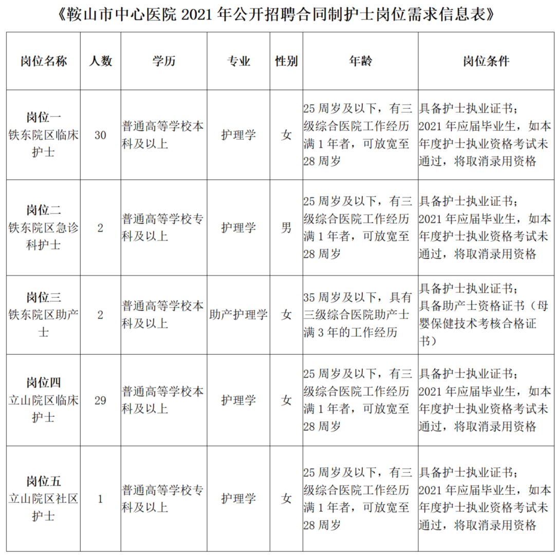 招聘岗位、岗位简介、资格条件等相关事宜可通过鞍山市中心医院官方网站、鞍山市中心医院微信公众号招聘公告附件1查询。