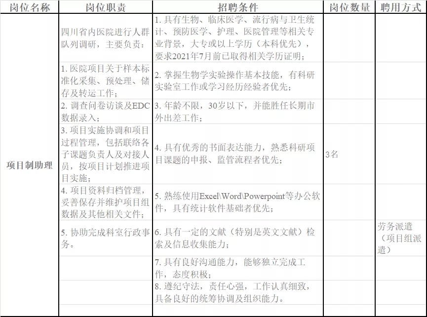 因工作需要,华西医院临床研究管理部面向社会公开招聘3名项目制工作人员,详情如下: