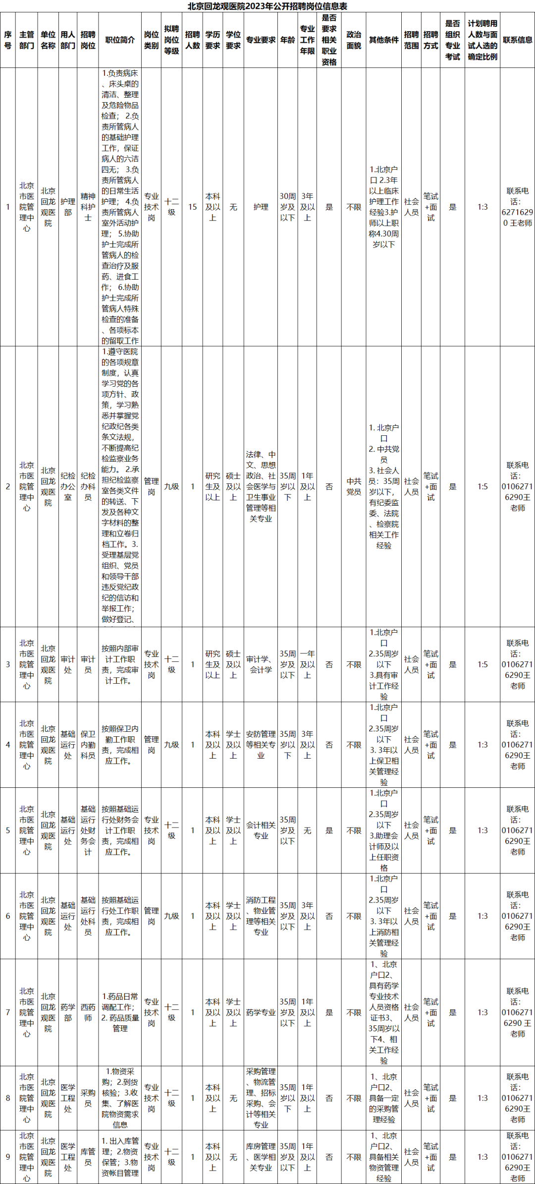 北京回龙观医院是北京市医院管理中心直属三级甲等精神卫生专科医院、北京大学回龙观临床医院、中法友好合作医院。医院占地147543平方米,设置病床1369张,从业人员近1300人。设有普通精神科、临床心理科、康复科、老年科、心身医学科、中西医结合科、司法鉴定科、社会工作科、精神医学研究中心、心理危机研究与干预中心等。公司创建的全国首个心理危机研究与干预中心的专业水平在国内同行业中处于领先地位。根据《北京市事业单位公开招聘工作人员实施办法》(京人社专技发〔2010〕102号)及《关于进一步规范事业单位公开招聘有关问题的通知》(京人社专技发〔2012〕247号)规定,结合公司工作,现将公司2023年招聘事宜公告如下: