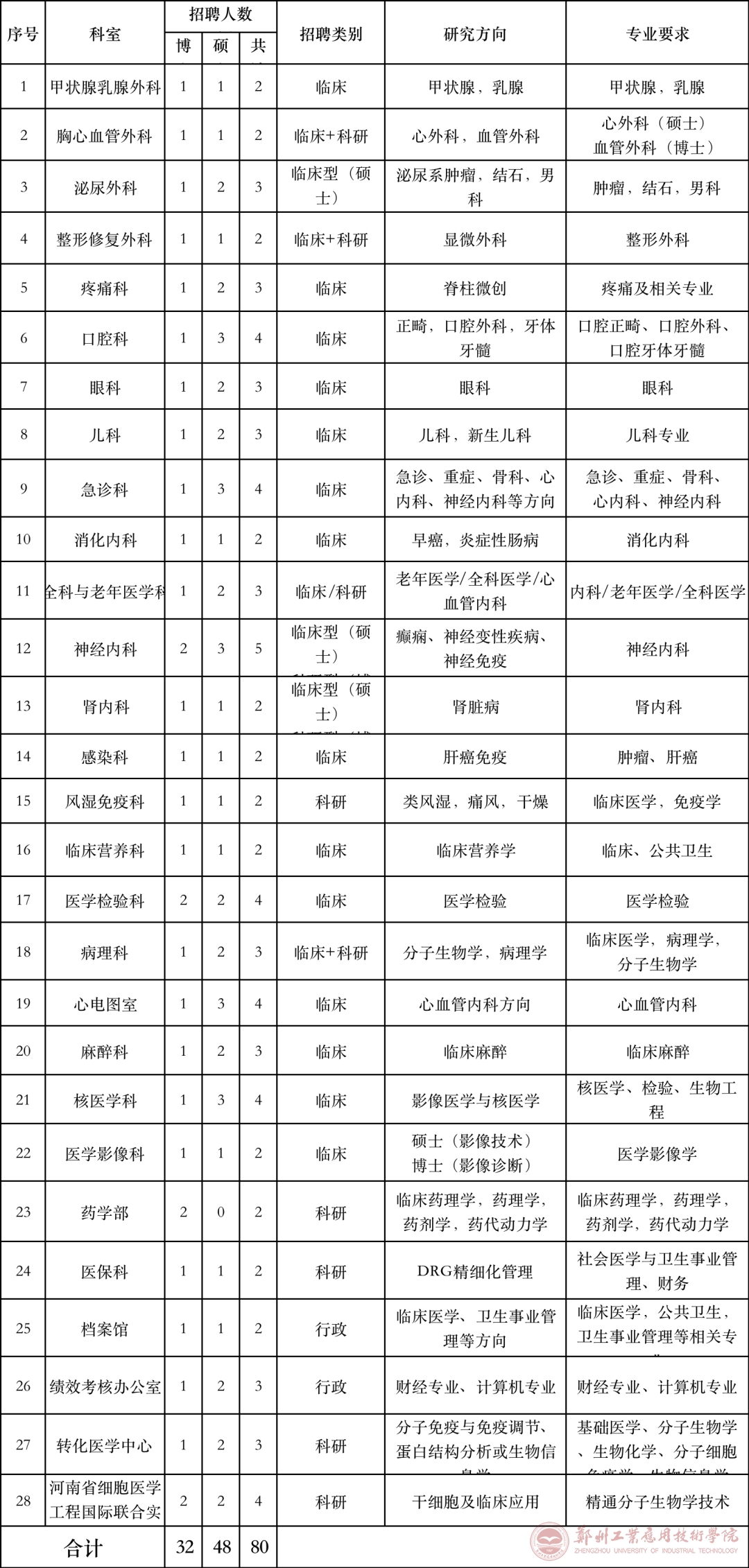 医院目前拥有国家临床重点专科建设项目1项(呼吸病学),省级区域医疗中心2个(呼吸病学区域医疗中心、消化病学区域医疗中心),河南省医学重点学科13个,河南省重点中医专科1个,河南省医学培育学科6个,共计20个河南省医学重点(培育)学科。临床医学为省教育厅一级重点学科,中医科为省中医重点专科建设单位。医院转化医学中心设有“感染性疾病转化医学河南省工程实验室”、“河南省细胞医学工程国际联合实验室”、“脓毒症研究国际联合实验室”、“炎性疾病与免疫调控医学实验室”等基础医学科研平台。同时,公司拥有国家卫生健康委住院医师规范化培训基地及全科医师培训基地、国家普通外科专科医师培训基地、国家临床药物试验基地、国家临床药师规范化培训学员培训中心、国家卫生健康委高级卒中中心、国家卫生健康委胸痛中心、国家卫生健康委冠心病介入培训机构、中国医师协会腹腔镜外科医师培训基地。为进一步加强公司卫生人才队伍建设,合理配置卫生人力资源,结合医院实际,按照全年招聘计划,发布本次招聘公告。