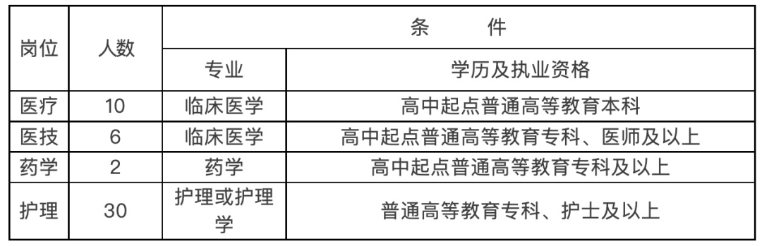 二、招聘岗位医疗、医技、药学、护理等,具体招聘岗位、条件及人数详见下表: