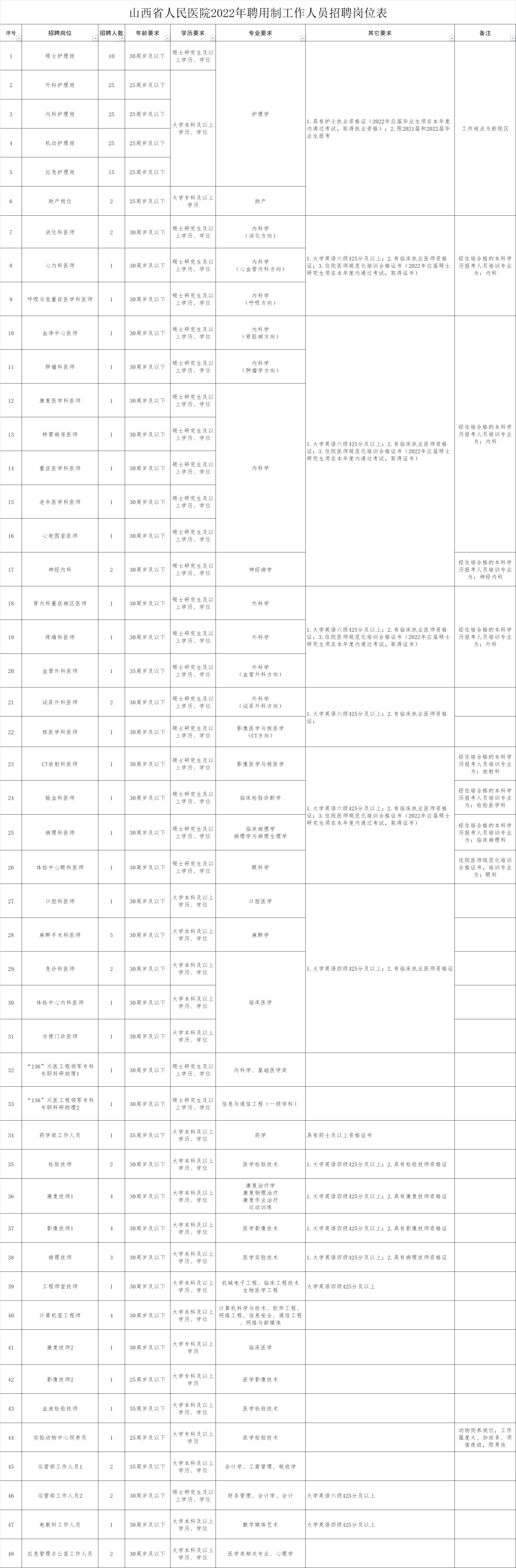 一、招聘计划及岗位具体要求山西省人民医院2022年招聘聘用制工作人员167名,招聘岗位及所需的具体条件以《山西省人民医院2022年聘用制工作人员招聘岗位表》(附件1,以下简称《岗位表》)中的要求为准。