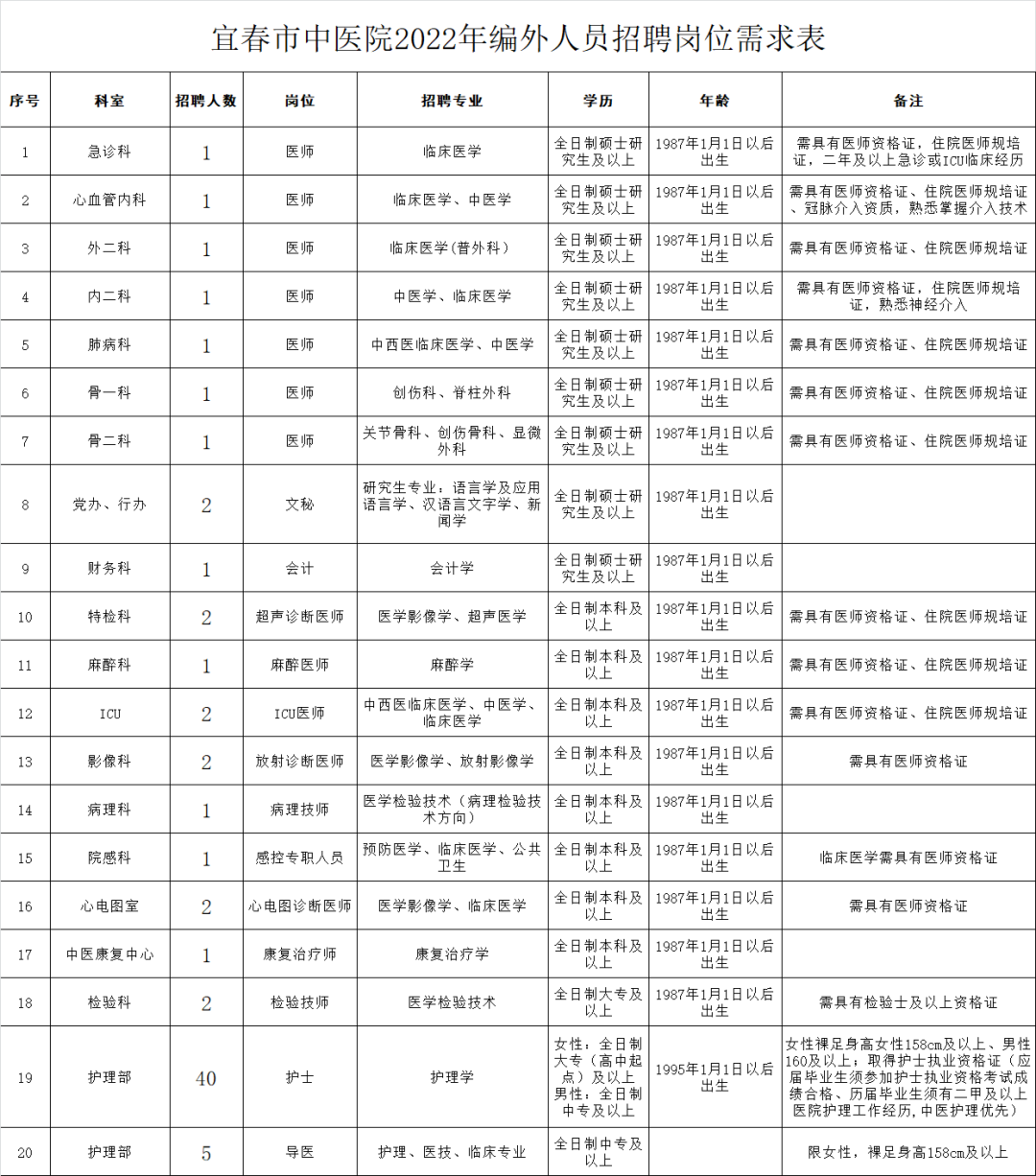 二、岗位需求见《宜春市中医院2022年编外人员招聘岗位需求表》