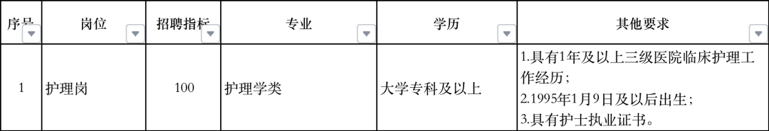 一、招聘条件1.具有中华人民共和国国籍,遵纪守法,具有良好的思想品德和职业道德素质;2.具有普通高等教育大学专科及以上学历。持有香港、澳门、台湾和国外院校毕业证书的人员,所学内容要与岗位需求相一致,且需出具教育部门的学历认证;3.1995年1月9日及以后出生,身体健康,能够适应岗位工作要求;4.具有1年及以上三级医院临床护理工作经历,具有护士执业证书,具备岗位所需的知识水平和专业能力;5.具备招聘岗位所规定的其他条件。凡有下列情形之一者,不得报考:1.受过刑事处罚或正在接受立案审查的;2.尚未解除党纪、政纪处分的;3.被开除公职的;4.现役军人;5.在公务员招考和事业单位公开招聘中被认定有作弊行为,在禁考期限内的;6.列入失信联合惩戒对象名单被依法限制招聘为事业单位工作人员的;7.法律法规规定不得招聘到事业单位的其他情形。