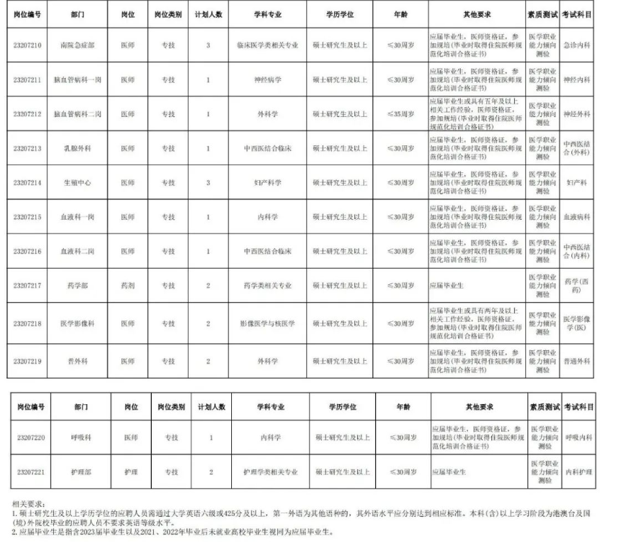 二、招聘人员条件(一)应聘人员应具备以下条件:1.具有中华人民共和国国籍;2.遵守宪法和法律;3.具有良好的品行;4.具有岗位所需要的专业或技能,参照教育部发布的普通高等院校专业指导目录执行;5.具有适应岗位要求的身体条件;6.具有岗位规定的其他条件;7.报名年龄计算的截止日期为报名工作第一日;8.全日制非津生源应届毕业生需符合天津市落户条件;外省市人员需符合天津市引进人才的相关政策;9.对于国内高等院校自主设置的专业与海外留学归国人员所学专业,注重专业内容实质,此类应聘人员的专业方向与所需专业方向要求一致视为符合专业条件;10.面向社会招收的住院医师如为普通高校应届毕业生的,其住培合格当年在医疗卫生机构就业,按当年应届毕业生同等对待。经住培合格的本科学历临床医师,按临床医学、口腔医学、中医专业学位硕士研究生同等对待。其中住培合格证书中的培训专业应当与招聘岗位的专业或类别要求相一致。(二)凡有下列情况之一者,不得报考:1.曾因犯罪受过刑事处罚或曾被开除公职的人员;2.正在接受立案审查的人员;3.在公务员招考和事业单位公开招聘中被认定有作弊行为,在禁考期限内的人员;4.全日制在读的非应届毕业生;5.现役军人;6.列为失信联合惩戒对象被依法限制招聘为事业单位工作人员的人员;7.法律规定不得聘用的其他情形的人员;8.报考人员不得报考聘用后即构成回避关系的招聘岗位。三、公开招聘程序
