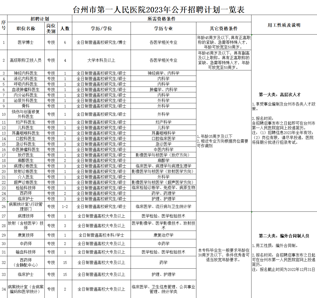二、招聘说明(一)符合上述招聘计划要求人员可自即日起可登陆台州市第一人民医院官网—人才招聘-投递简历。岗位有限,请尽早报名,医院将择期分批进行招录考试。(二)通过市人社局及卫生健康委公考入编的岗位计划未在上述招聘计划范围内,医学类专业本科学历人员、非医学类专业本科及以上学历人员请关注市人社局、市卫生健康委的公开招聘公告,具体的岗位人数、资格条件及报名考试时间以上级主管部门发布的公告为准。