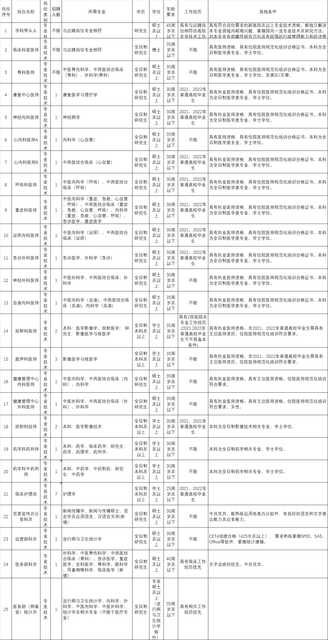 二、招聘基本条件1.具有中华人民共和国国籍。2.遵守宪法和法律。3.具有良好的品行和职业道德,热爱医疗事业。4.具有岗位所需的专业或技能条件。5.适应岗位要求的身体条件。6.岗位所需的其他条件。7.有下列情形之一的不得应聘:(1)受到党纪、政纪处分期限未满或者正在接受纪律审查的人员;(2)受到刑事处罚或者正在接受司法调查尚未做出结论的人员;(3)现役军人、在读的非应届高校毕业生;(4)法律法规规定不得招聘到事业单位的其他情形的人员。