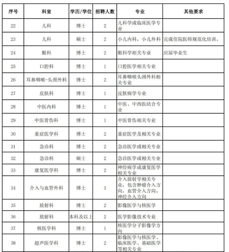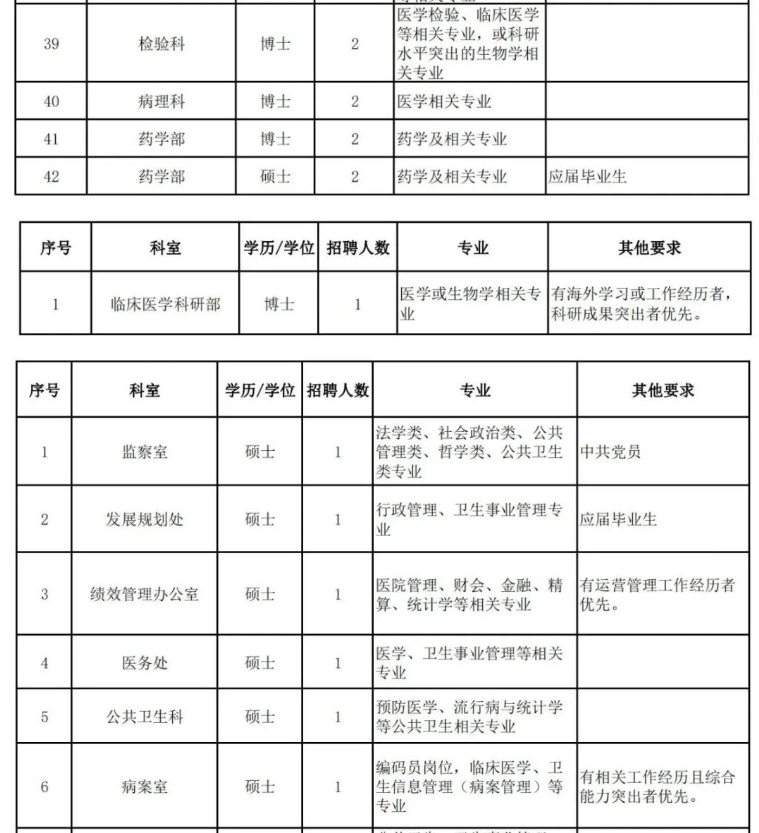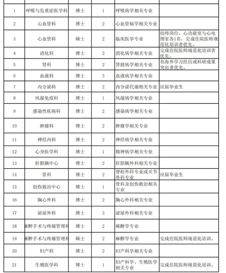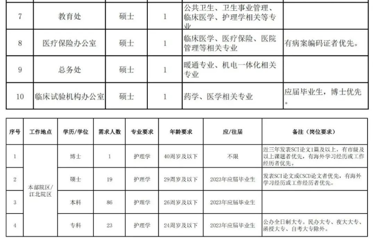 一、岗位招聘(一)招聘岗位 本次公开招聘包含本部及江北院区两个院区的人员需求,具体工作地点由医院与科室统筹安排,其中临床医技岗位77人,专职科研人员1人,管理岗位10人,护理岗位129人。高层次人才引进人数不受专科与岗位限制,全职博士后和在职博士后人数不限。具体岗位、招聘人数及要求参见各岗位列表。