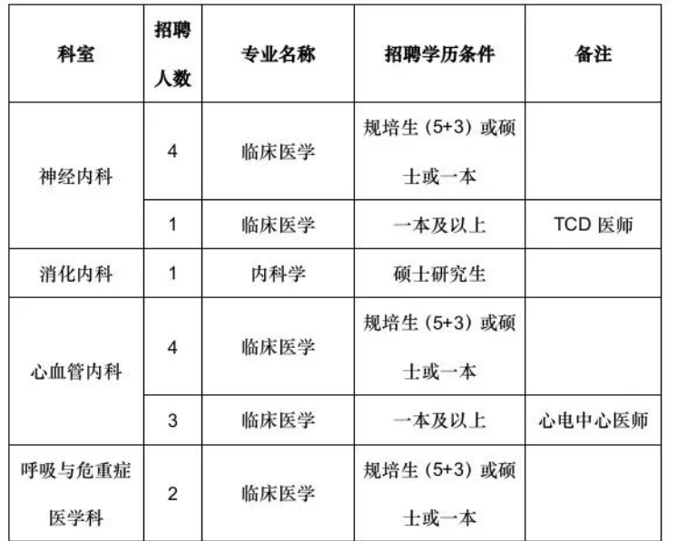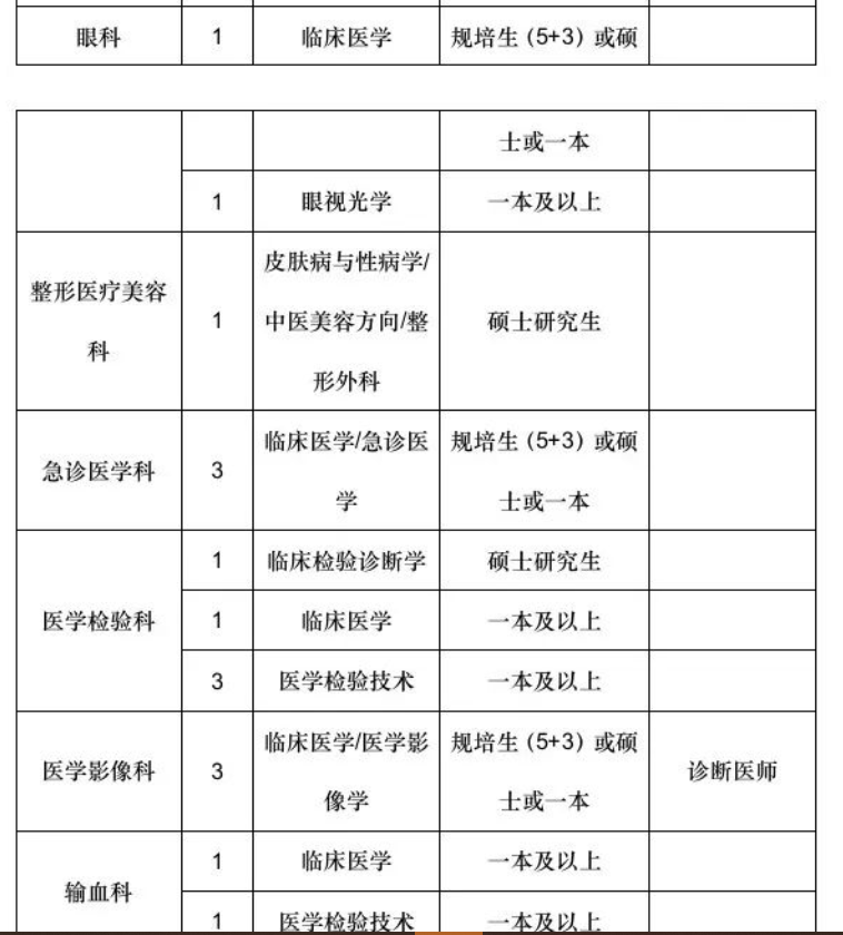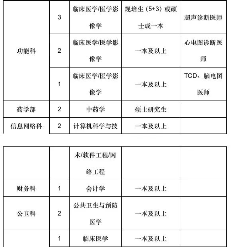一、招聘详情报名者应当具备下列资格条件:1.有中华人民共和国国籍;2.遵守国家法律、法规,享有公民的政治权利;3.有良好的品行,愿意履行事业单位工作人员的义务,遵守事业单位工作纪律;4.有符合国家或行业规定并能坚持正常工作的年龄条件和身体条件;5.取得国家承认的岗位条件要求的学历;6.具有应聘岗位要求的其他条件(详见下方附件)。有下列情形之一的,不受理应聘:1.受到党纪、政纪处分或刑事处罚,正在处分(罚)期间的;2.正在接受纪律审查、司法调查或者审计的;3.曾因犯罪受过刑事处罚或者曾被开除公职;4.法律、法规、规章及政策规定可不受理应聘的人员。年龄要求:本科生30周岁及以下,硕士研究生、规培生35周岁及以下。年龄计算截止时间为:2023年1月1日。学历要求:学历不包括自考、成教、专升本。