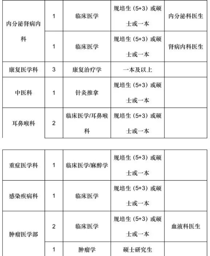 三、待遇详情规培生、硕士研究生以上学历人员经面试合格后,与医院签订三方协议,按规定办理事业单位聘用手续和编制手续。本科生根据人社部门事业单位公开招聘程序,组织考试、考察、体检等程序后,可办理事业单位工作人员聘用手续。事业单位公开招聘考试时间以人社部门通知为准。博士研究生、学科带头人安家费:博士研究生20-50万元;学科带头人安家费30万元。带有省级及以上科研项目者给予科研启动基金10-30万元。生活补贴:3000元/月,连续发放5年。按高层次人才引进方式办理事业编制。硕士研究生安家费:5-10万元。生活补贴:1800元/月,连续发放1年。按高层次人才引进方式办理事业编制。规培生(本科)安家费:985、211、双一流院校毕业生发放安家费3万元。生活补贴:1500元/月,连续发放1年。按程序通过市人社部门办理事业编制。本科生(不含规培生)生活补贴:1000-1500元/月,连续发放1年。通过市人社部门招聘考试者办理事业编制。