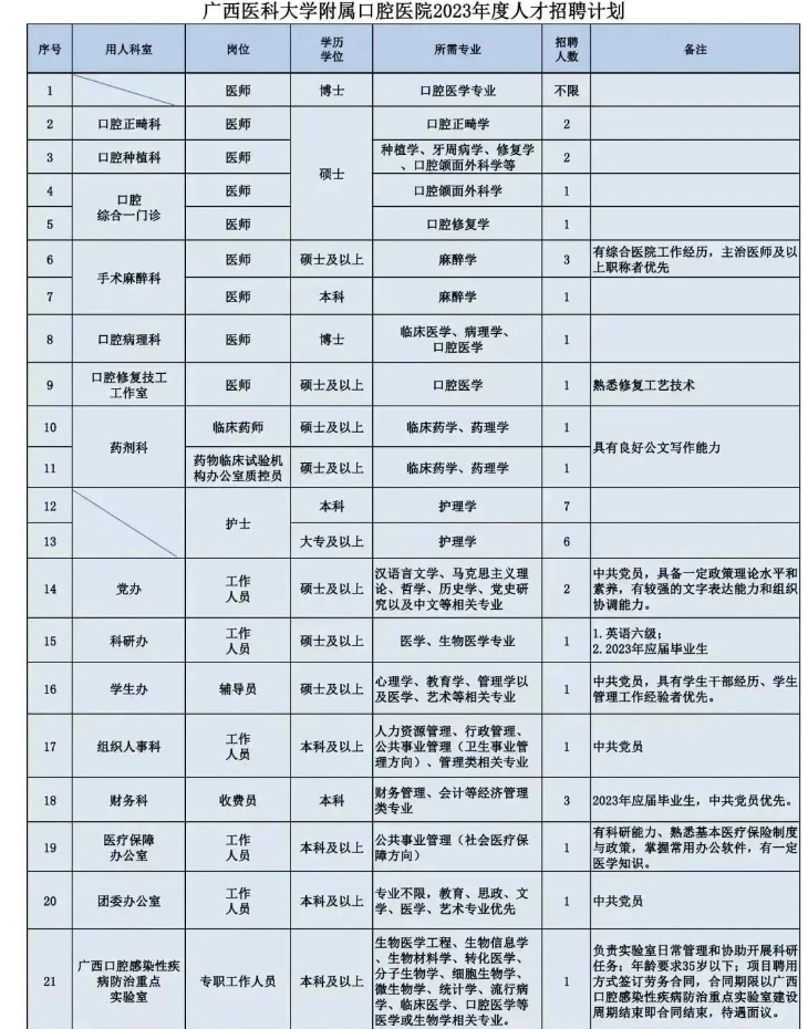 广西医科大学附属口腔医院(口腔beat365)坐落在具有“绿城”之称的广西壮族自治区首府南宁市,是广西口腔医学专业技术人员最多、专业最齐全、医疗设备最先进、技术力量最雄厚,集教学、科研、医疗、预防保健为一体的三级甲等口腔专科医院,是目前规模最大的面向东盟国家招收口腔医学本、硕、博员工的高等beat365校。医院现有两个院区,两个分门诊,五象新院区将于2023年投入使用,建成后将成为辐射东盟的国际化口腔医学教育、医疗服务、疾病预防、医学研究及职业培训中心。根据公司工作需要,现面向社会公开招聘医师、药师、护理及行政等岗位人才若干名,现公布广西医科大学附属口腔医院2023年度人才招聘简章。