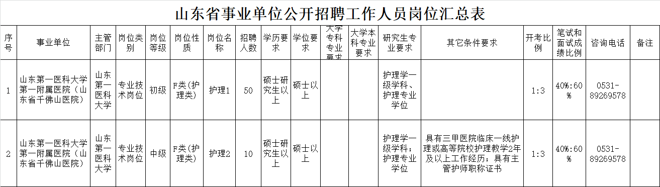 根据中共山东省委组织部、山东省人力资源和社会保障厅《关于印发2023年度省属事业单位公开招聘工作实施方案的通知》(鲁人社发〔2022〕23号)要求,结合工作需要,山东第一医科大学第一附属医院(山东省千佛山医院)拟面向社会公开招聘工作人员 60人,具体岗位及条件详见《山东省事业单位公开招聘工作人员岗位汇总表》(附件1)
