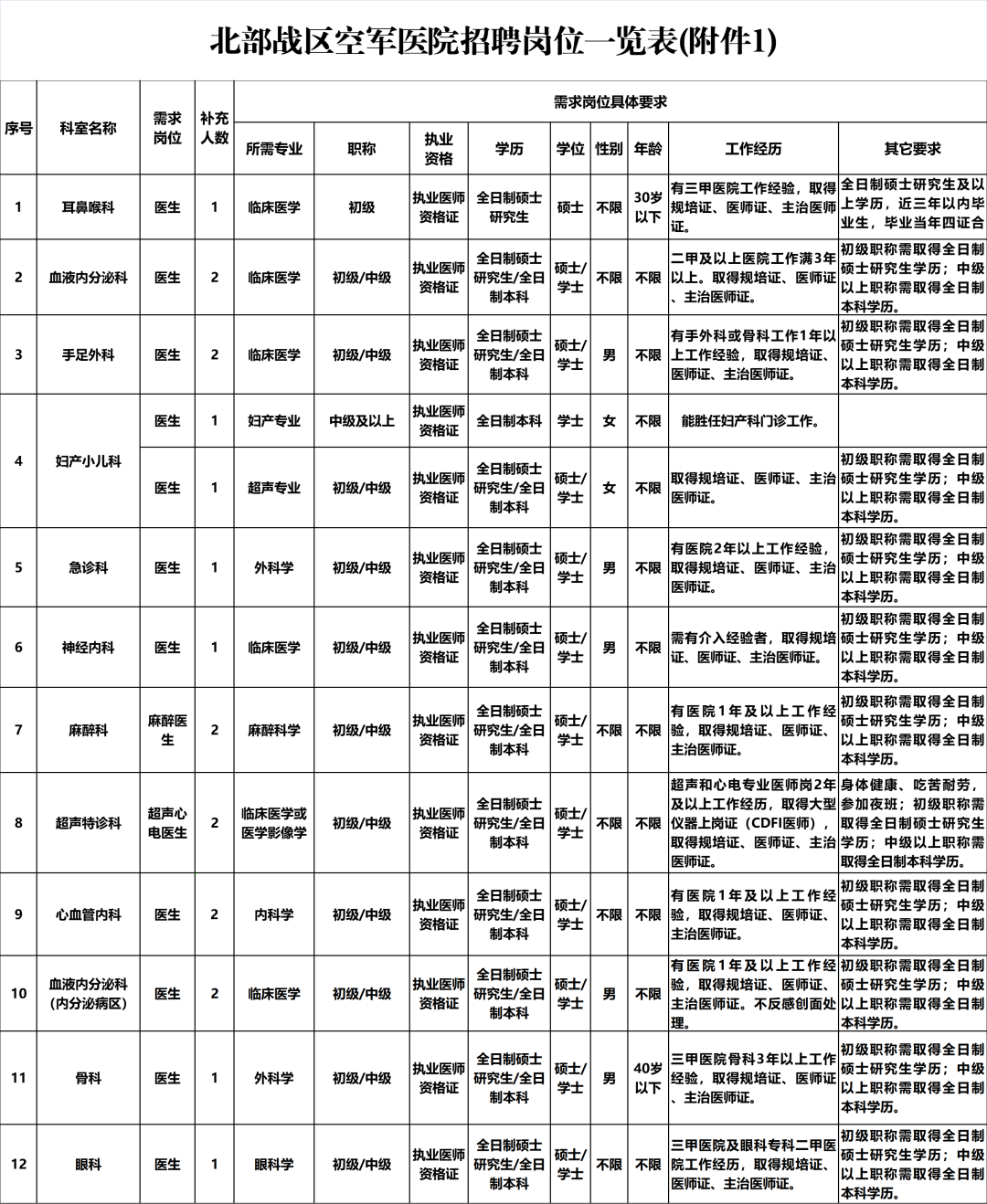 医院计划招聘医疗、卫生技术、护理类工作人员35名,具体岗位详见《北部战区空军医院2023年度招聘岗位一览表》(附件1),同时在丁香人才网(https://www.jobmd.cn/company/2515678.htm)、中国医疗人才网(http://www.doctorjob.com.cn/resume/util/254654.html)均可查看招聘岗位信息。