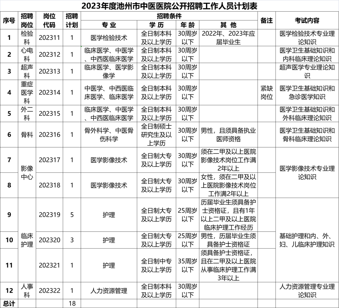 本次公开招聘岗位计划共18名(详见附件)。招聘公告、岗位、条件等信息于2023年4月25日起在池州市人事考试网(http://rskszx.czsrsj.chizhou.gov.cn)、池州市贵池区人民政府网(http://www.ahgc.gov.cn/)、池州市中医医院(http://www.chzzyyy.com/)等网站上发布。