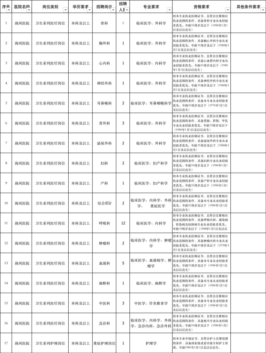 天津市海河医院是以治疗呼吸系统疾病为特色,集医疗、教学、科研为一体的天津市卫生健康委直属三级甲等综合性医院,天津市呼吸疾病研究所所在地,同时为天津大学海河医院,天津医科大学临床公司,是国家重点投资建设的现代化医院之一。医院现有职工一千余人,拥有一大批全国知名专家和学科带头人及高级专业技术职务的医务人员,其中研究生学历及硕、博研究生导师二百余人,硕博研究生导师二十余名。现为满足公司相关专科发展需求,按照公司招聘编制外人员工作有关规定,现面向社会公开招聘人事代理制工作人员,为确保本次工作顺利进行,有关事项公告如下: