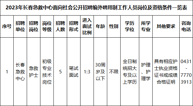 长春“120”全称长春急救中心暨吉林省医疗急救指挥中心,是长春市唯一一家担负院前急救工作的专业医疗机构。它主要承担长春市及周边地区的日常院前急救,病人长途运送监护,重大灾害、伤亡事故的医疗救援,突发公共卫生事件的应急医疗救援,重大节庆、大型体育赛事、大型群众集会及其他社会公益性急救保障任务。为满足长春急救事业发展需要需求,经长春急救中心研究决定,实施面向社会公开招聘编外聘用制工作人员工作,现将有关事宜公告如下:一、招聘计划本次招聘提供1个岗位,计划招聘工作人员5名。具体招聘岗位及资格条件详见附件《2023年长春急救中心面向社会公开招聘编外聘用制人员岗位及资格条件一览表》。